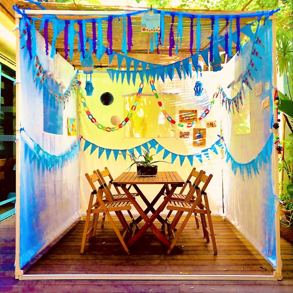 The Sukkah has a frame but it is thin, it has walls but no door, it has a roof but it is not sealed. The space created in the Sukkah plays between inside and outside, between nature and culture, between open and safe. This space allows us to get out of our comfort zones, away from the familiar and habitual, and into the different, unconventional, and temporary; but all in a way that does not threaten us. After all, we are at home.
