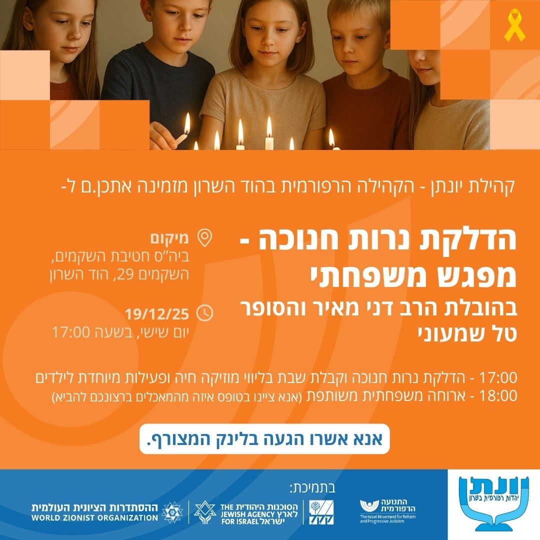🎵 מוזמנות.ים להצטרף להדלקת נרות חנוכה ומפגש משפחתי של קהילת יונתן – הקהילה הרפורמית בהוד השרון.