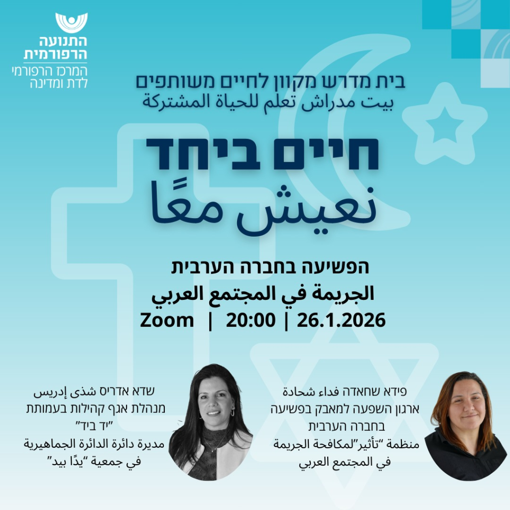 פעילות למען חיים משותפים היא מאתגרת ומורכבת, במיוחד בזמן מלחמה, לכן נתכנס יחד לבית מדרש מקוון בו  נלמד על החברה הערבית שלאחר ה-7 באוקטובר, על דרכי הפעולה למען חיים משותפים, נקבל כלים פרקטיים והכי חשוב – נשאב תקווה ונפעל למען חיים טובים יותר לכל יושבי הארץ הזו.